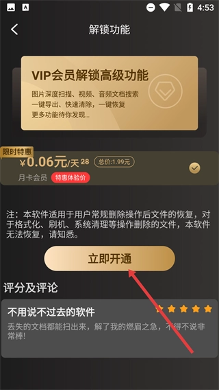 4、恢复功能需要开通VIP会员,点击【立即开通】按钮解锁高级功能后,即可完成恢复操作。