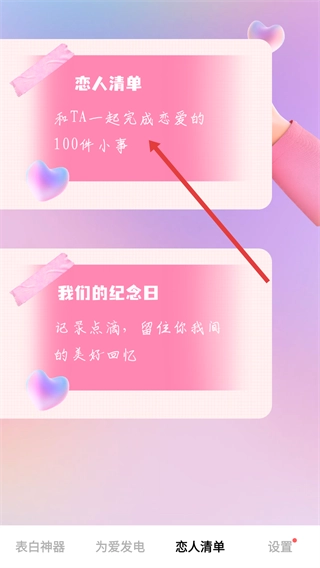 在恋人清单页面,点击【和TA一起完成恋爱的100件小事】选项,即可进入恋爱小事列表页面。