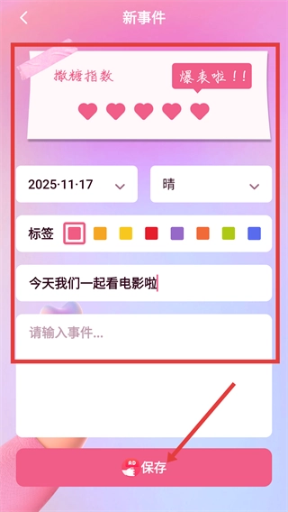 4、进入新事件编辑页面后,依次填写日期、天气、标签以及事件内容,随后点击【保存】按钮,即可完成恋爱事件的记录。