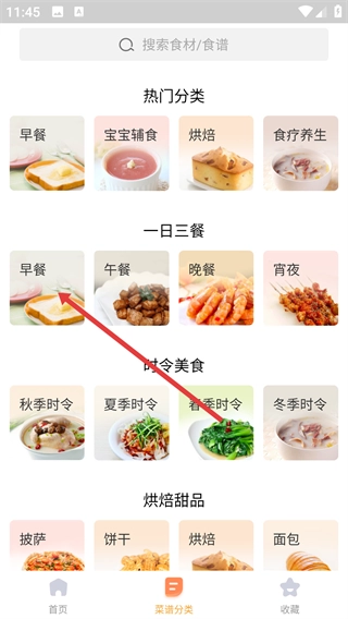 2、在菜谱分类页面的一日三餐板块里,点击【早餐】选项,即可进入早餐菜谱列表页面。