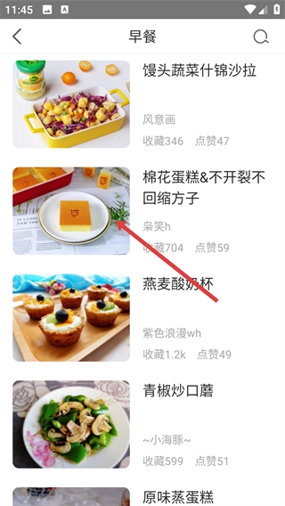 3、在早餐菜谱列表页面挑选自己感兴趣的菜谱,比如【棉花蛋糕&不开裂不回缩方子】。
