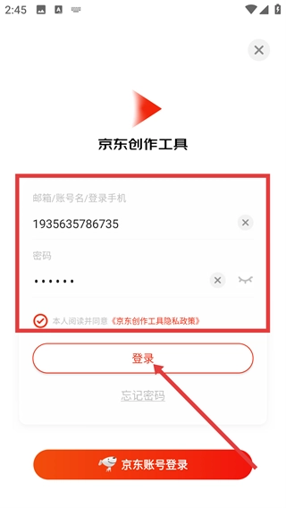 4、在登录界面,输入【邮箱/账号名/登录手机】及密码,勾选同意【京东创作工具隐私政策】后,点击【登录】按钮即可完成登录操作。