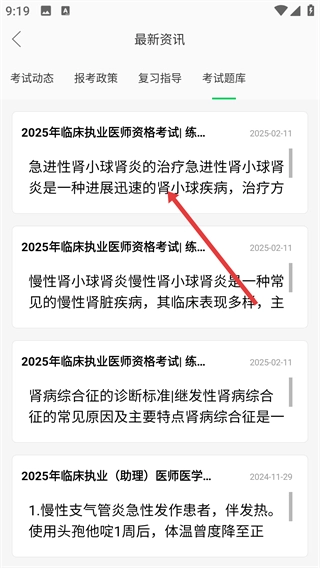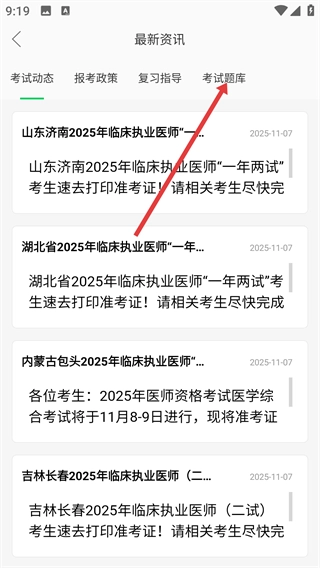 进入【最新资讯】页面后,点击【考试题库】标签,就能查看与题库相关的资讯内容。