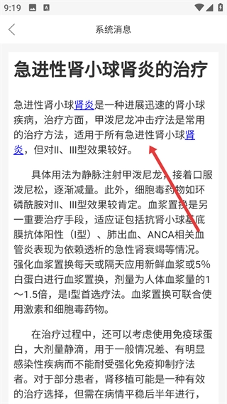 进入具体文章页面后,能够查看【急进性肾小球肾炎的治疗】相关的详细知识,其中涵盖甲泼尼龙冲击疗法、血浆置换等具体治疗手段。