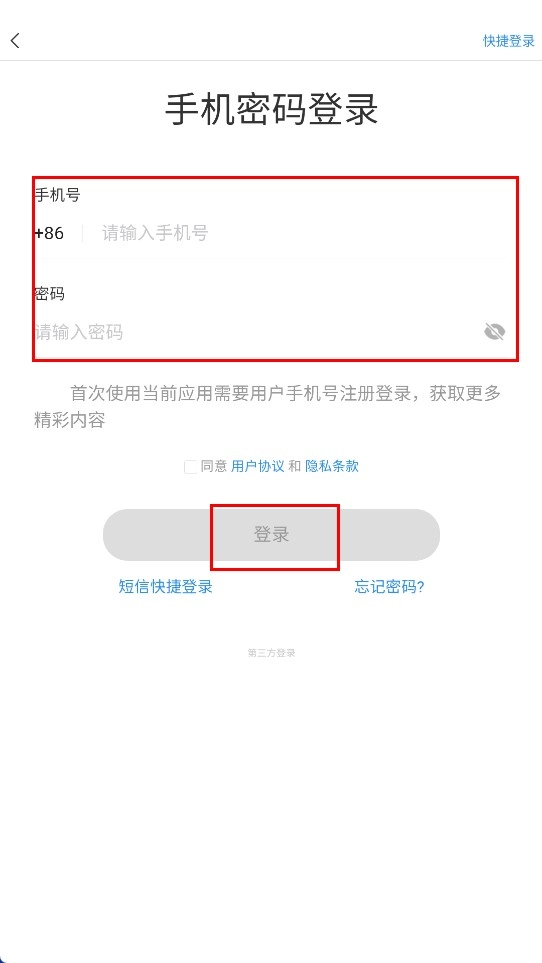 4、也可以选择【账户密码登录-功能选项】,输入手机号和密码后,点击【登录-功能按钮】完成登录操作。