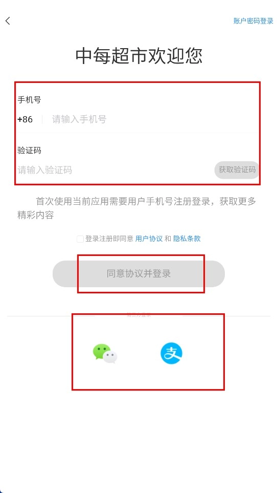 3、登录页支持两种登录方式:一是输入手机号与验证码后,点击【同意协议并登录】功能按钮;二是选择微信或支付宝第三方登录。