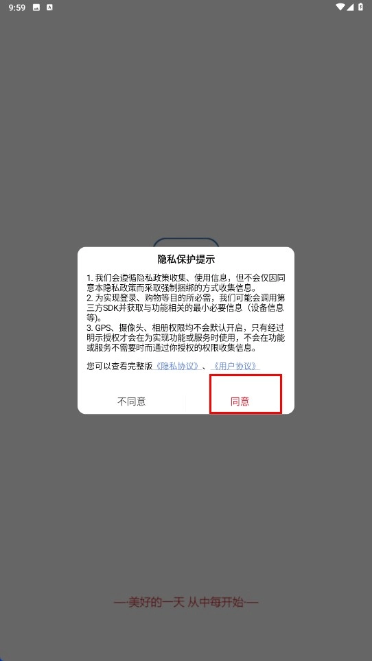 1、当出现隐私保护提示弹窗时,点击弹窗中的【同意】功能按钮,即可进入应用页面。