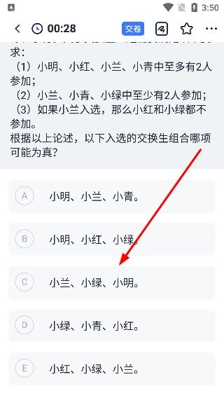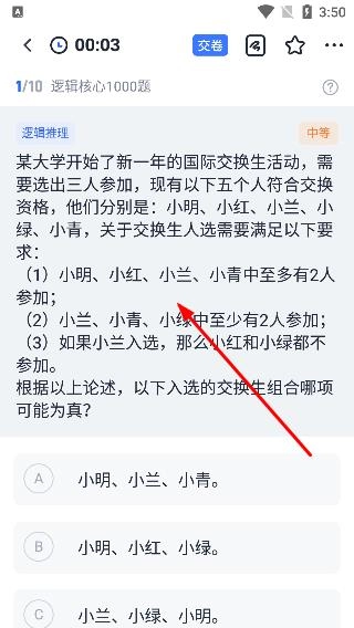 3、在题目练习页面仔细阅读题目内容,对题干中给出的各项条件进行分析,例如交换生选拔所涉及的三个具体要求。