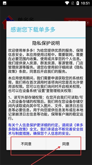 首次使用单多多时,需点击【同意】按钮以确认同意隐私保护说明,之后即可进入登录注册页面。