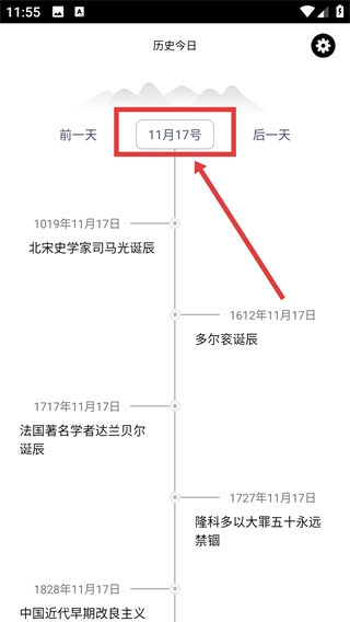 1、在历史今日页面,点击【11月17日】,即可进入日期选择界面,通过该界面能够挑选其他日期来浏览对应的历史事件。