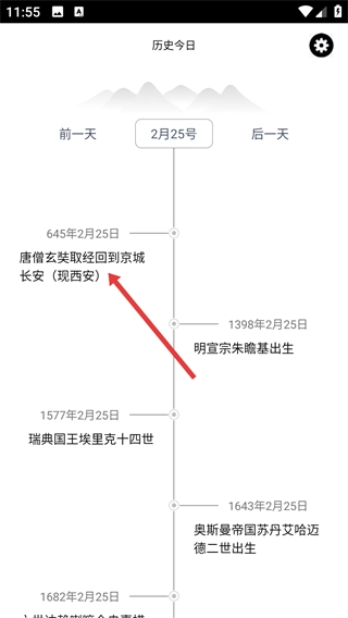 在日期选择页面,点击【2月25日】,即可切换至该日期对应的历史事件列表页面。