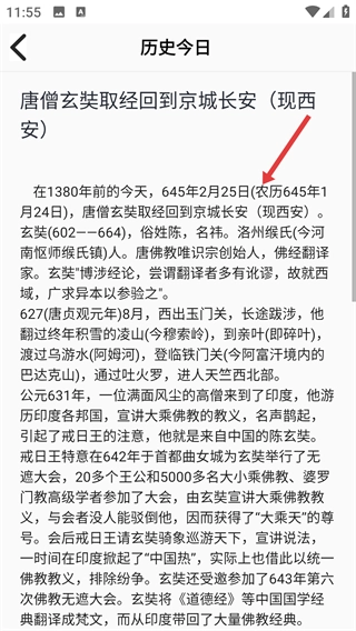 3、在2月25日的历史事件列表里,点击【唐僧玄奘取经回到京城长安(现西安)】这一项,即可进入该事件的详情页面。