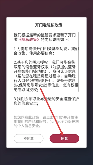 在【开门啦隐私政策】弹窗里,必须仔细阅读后点击【同意】按钮,才能继续使用这款应用。