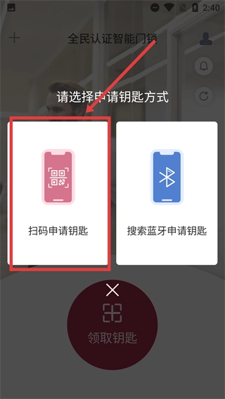 3、进入申请钥匙的方式选择页面后,点击【扫码申请钥匙】选项,即可进入扫码界面。