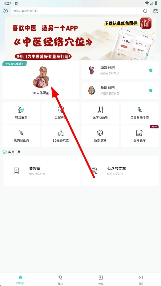 1、点击【3D人体解剖-功能图标】,即可进入3D人体解剖页面。