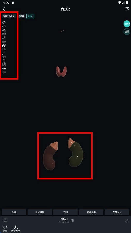 进入模型页面后,可借助左侧功能栏对模型执行定位、调整透明度等操作,以便查看肾脏等器官的细节。