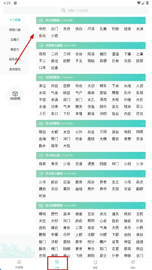 4、点击底部的【经络】功能按钮,进入经络页面后,就能查看十二经络以及相关的穴位信息。