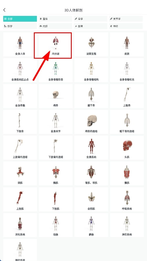 2、在页面中找到【内分泌-解剖分类】选项并点击,即可查看内分泌系统的3D模型。