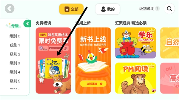 2、进入图书馆页面后,挑选绘本专辑(比如免费畅读类),接着进入绘本列表页面。