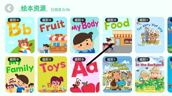 3、在绘本列表里,挑选你要找的目标绘本(例如级别0的《Food》),然后进入该绘本的详情页面。