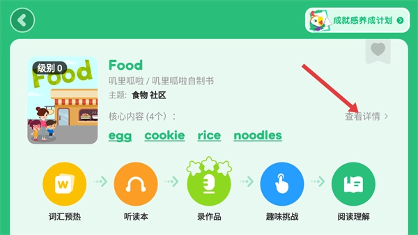4、在绘本详情页面,你可以查看其核心内容,参与“词汇预热”“听读本”“录作品”等学习环节,还能点击【查看详情】按钮获取更多相关信息。