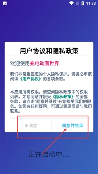 1、当充电动画世界启动后,点击“同意并继续”按钮,以此接受用户协议与隐私政策,随后即可进入使用流程。
