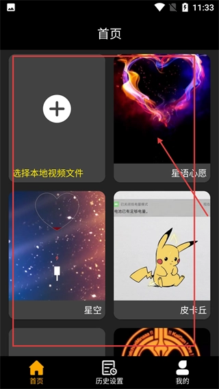 2、在首页,可选择“选择本地视频文件”或“星语心愿”“星空”“皮卡丘”等预设动画,这里选择“星语心愿”动画。