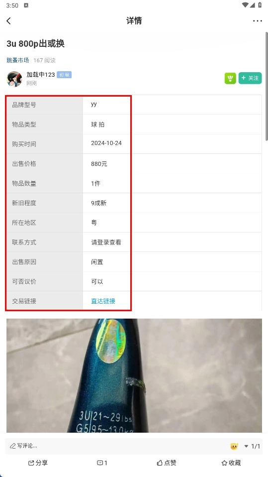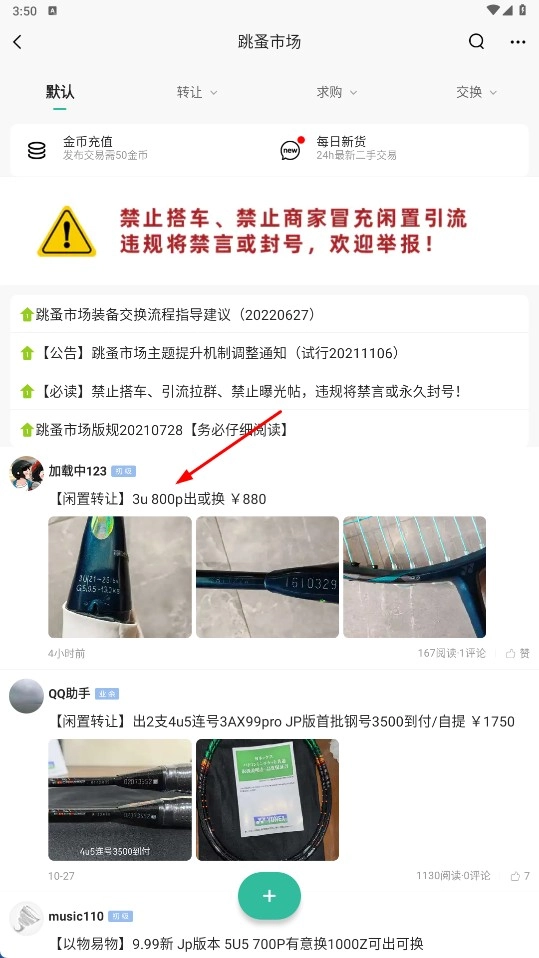 2、进入跳蚤市场页面后,浏览各类闲置物品的转让信息,挑选自己感兴趣的商品,比如羽毛球拍的转让帖子。