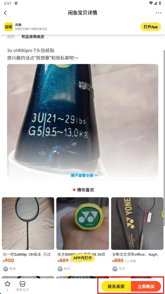 4、点击交易链接即可进入闲鱼宝贝详情页,之后可通过选择【联系卖家】或【立即购买】功能按钮来进行交易。