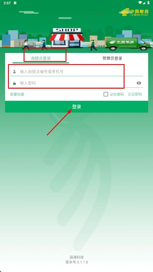 1、选择【自提点登录-登录方式】,输入自提点编号或者手机号以及密码,然后点击登录按钮完成登录操作。