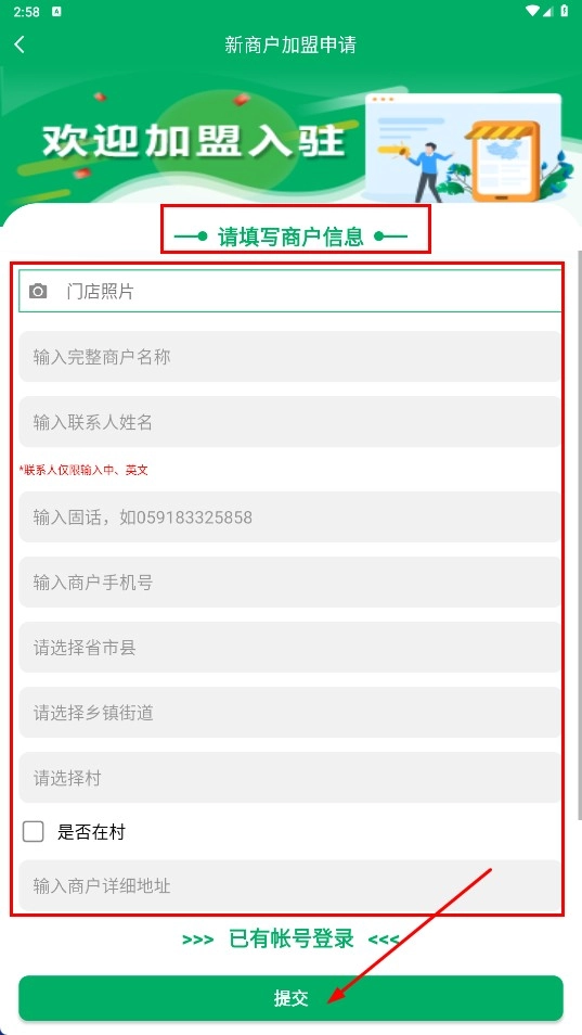 3、点击【我要加盟】功能按钮,进入新商户加盟申请页面,在该页面填写好商户相关信息后,点击【提交】功能按钮,即可完成加盟申请流程。