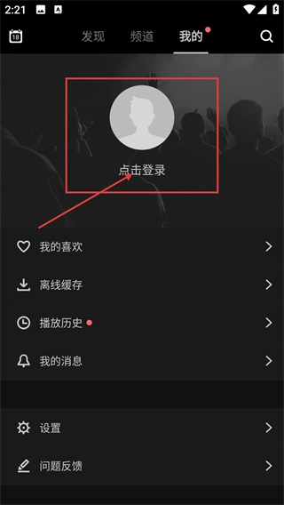 进入个人中心后,点击【点击登录】按钮就能进入登录页面,这个页面同时也设有【我的喜欢】【离线缓存】等功能的入口。