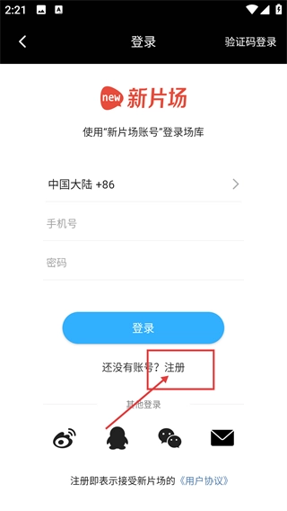 在登录页面,用户可以使用【新片场账号】的手机号与密码进行登录,同时也能选择【注册】或【其他登录】的方式。