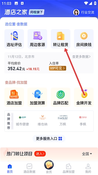 1、在【酒店之家】首页找到【转让租赁】功能按钮并点击,进入酒店转让租赁的信息列表页面。