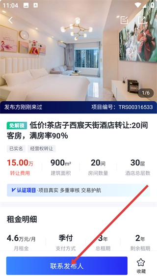 3、进入酒店转让详情页面,浏览项目信息后,点击【联系发布人】按钮,即可发起联系。