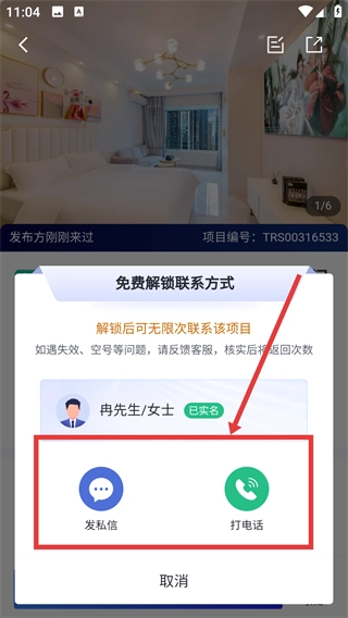 4、当【免费解锁联系方式】的窗口弹出后,可选择【发私信】或者【打电话】这两种方式,以此和发布人建立联系。