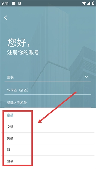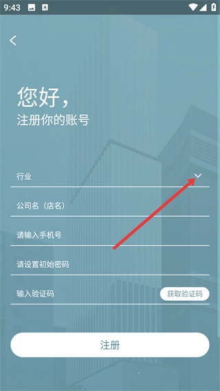 2、进入注册页面后,点击【行业】选项旁的下拉箭头,即可展开行业选择列表。