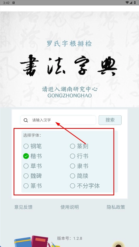 2、在主界面挑选字体(例如楷书),在搜索框中输入汉字,随后点击【搜索】功能按钮,即可进入字体列表页面。