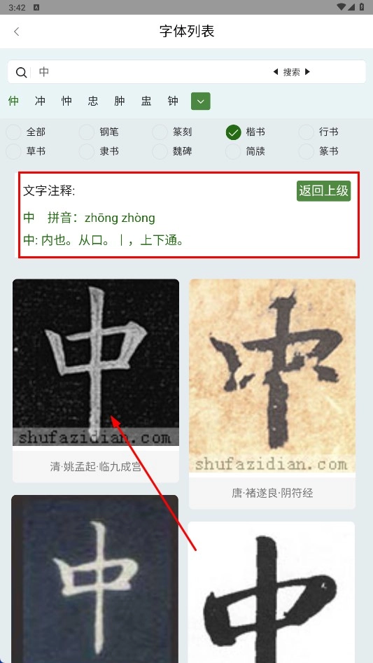 3、在字体列表页面能够查看文字注释以及各类书法作品的字体样式,点击自己感兴趣的字体样式,即可进入字体详情页面。