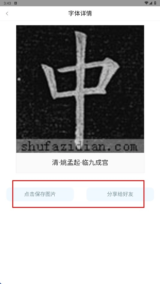 在字体详情页面,您可以点击【点击保存图片】按钮来保存字体图片,也能通过点击【分享给好友-功能按钮】将字体详情分享出去。