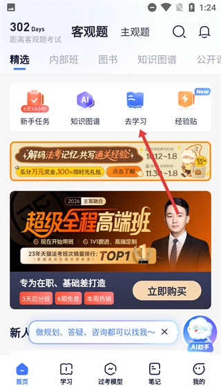 1、在首页找到并点击【去学习】按钮,即可进入学习板块,正式开启法考知识的学习流程。