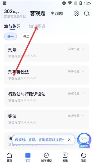 2、在学习页面点击【知识图谱】标签,切换到知识图谱页面后,就能按照学科查看对应的知识点了。
