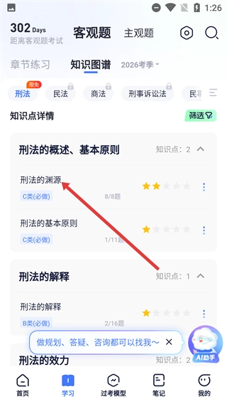 3、在知识图谱页面找到并点击【刑法的渊源】这一知识点,随后进入该知识点对应的强化练习模块。