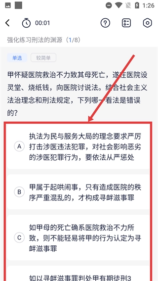 在知识点练习页面,用户能够查看包含A、B、C等选项的题目,通过进行法考题目练习来巩固相关知识点。