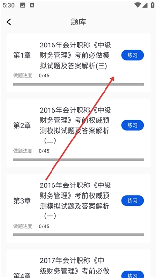 2、在题库界面找到目标章节对应的练习题,点击【练习】按钮。