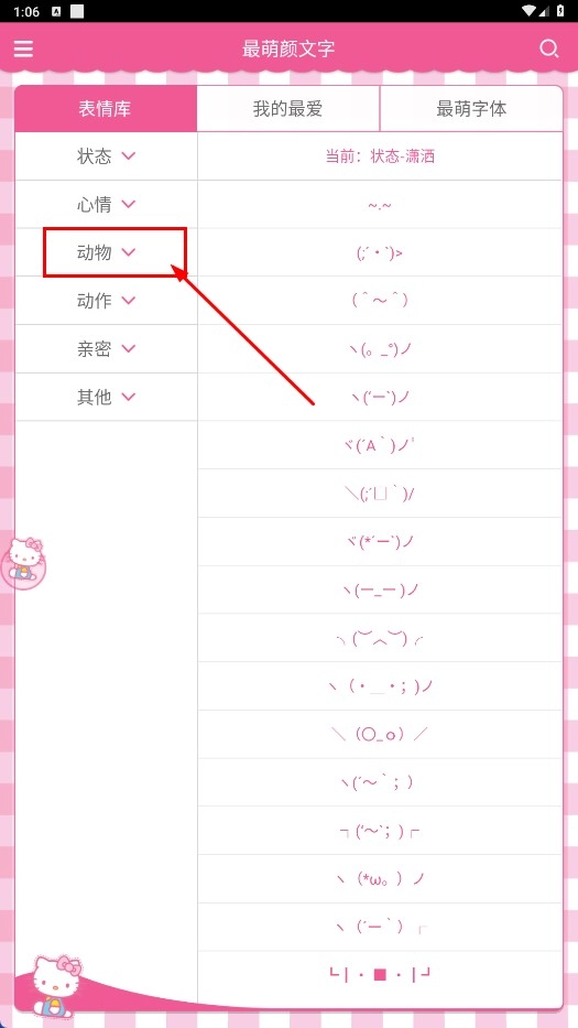 2、在主界面点击【动物-分类标签】,即可展开动物类颜文字的分类列表。