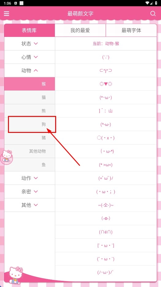 3、在动物分类中选择【狗-子分类】,即可查看狗类颜文字的列表。