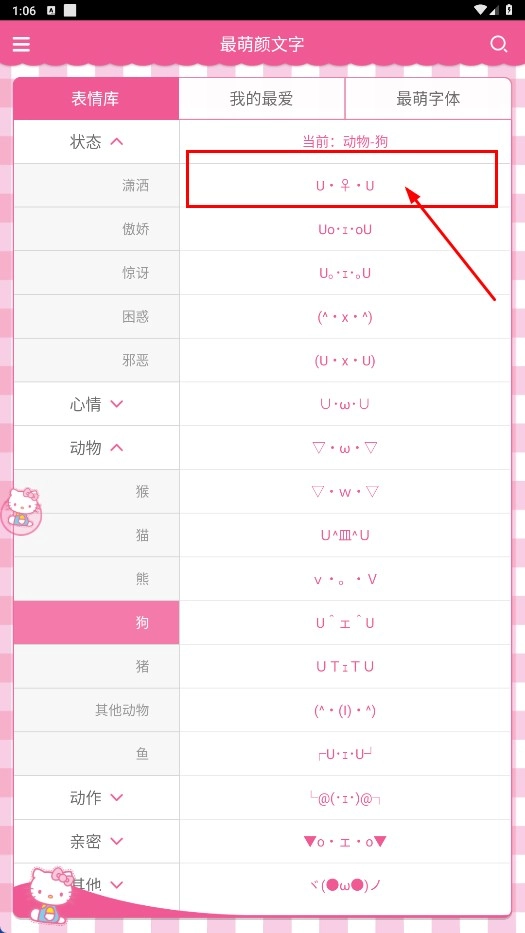 4、在狗类颜文字列表里,你可以挑选像“U・♀・U”这类颜文字来使用,点击一下就能完成复制粘贴操作。