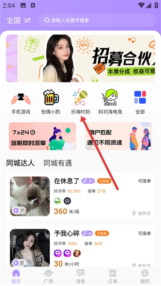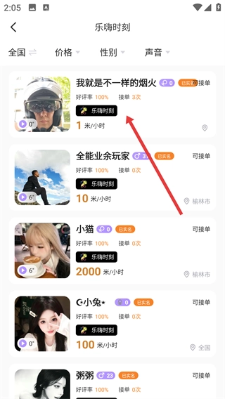 1、点击首页的【乐嗨时刻】分类,即可进入乐嗨时刻板块,查看该板块的用户列表。