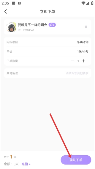 4、在立即下单页面确认陪练项目、单价、下单数量等信息后,点击【确认下单】按钮,即可完成下单操作。